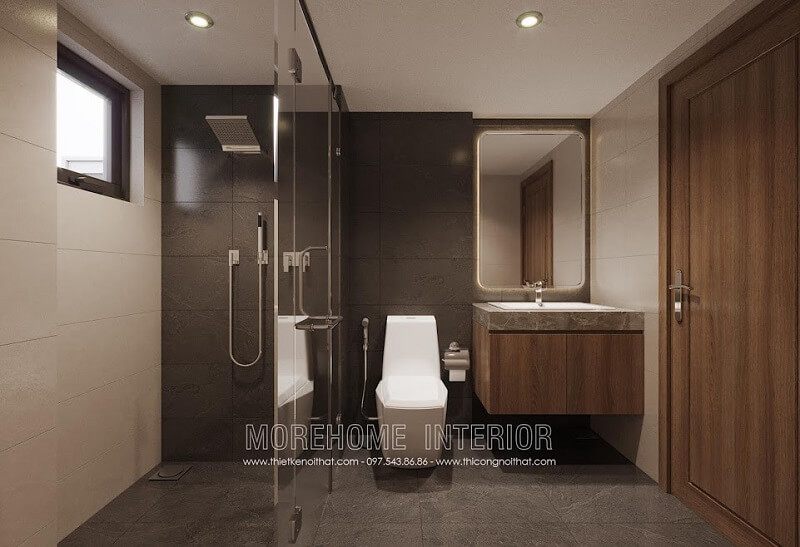 Mẫu thiết kế phòng tắm đẹp với nội thất thông minh, sử dụng vách tắm kính giúp phân chia khu vực tắm và vệ sinh
