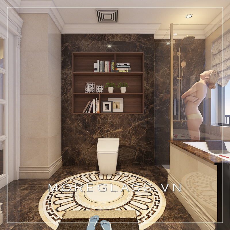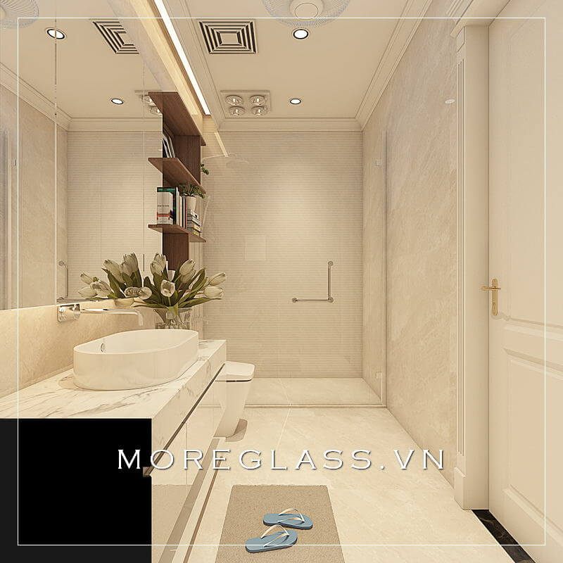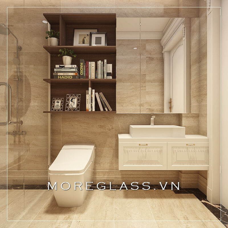 Mẫu thiết kế phòng tắm hiện đại, ngăn nắp với kệ trang trí được thiết kế trên bồn rửa tay, sử dụng vách kính phòng tắm cường lực để tránh làm bắn nước ra ngoài.