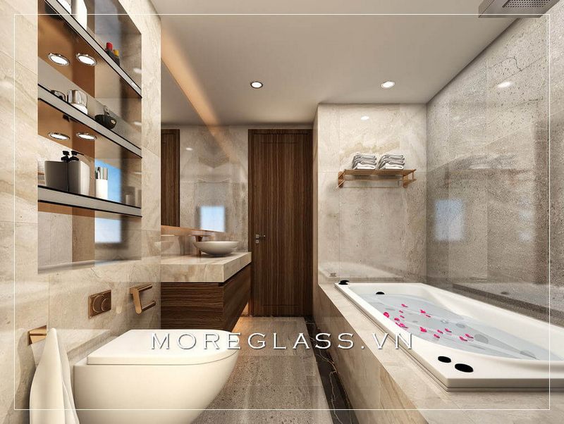 Thiết kế phòng tắm khách sạn 5 sao cao cấp với đầy đủ tiện nghi, sử dụng gạch lát nền màu be sang trọng và vách tắm kính cao cấp