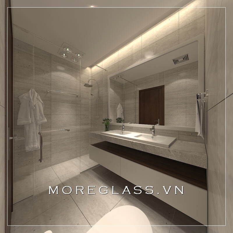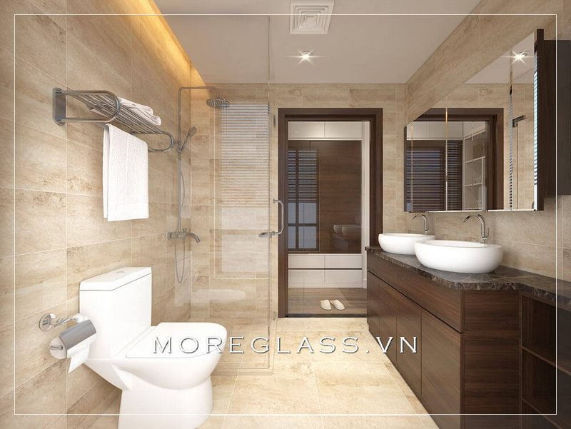 Mẫu thiết kế nhà tắm và nhà vệ sinh cao cấp cho biệt thự với kệ tủ lavabo gỗ tự nhiên, gương trang trí phòng tắm kích thước lớn và gạch ốp lát tông màu vàng ấm sang trọng