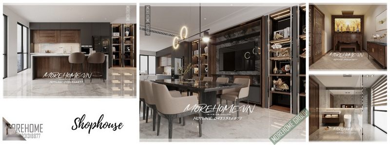 Thiết kế shophouse sang trọng không gian bếp ăn, phòng thờ và phòng tắm + WC ấn tượng. Với các sắp xếp bố trí nội thất khoa học, hợp lý mang đến sự gọn gàng, trẻ chung cho căn hộ.