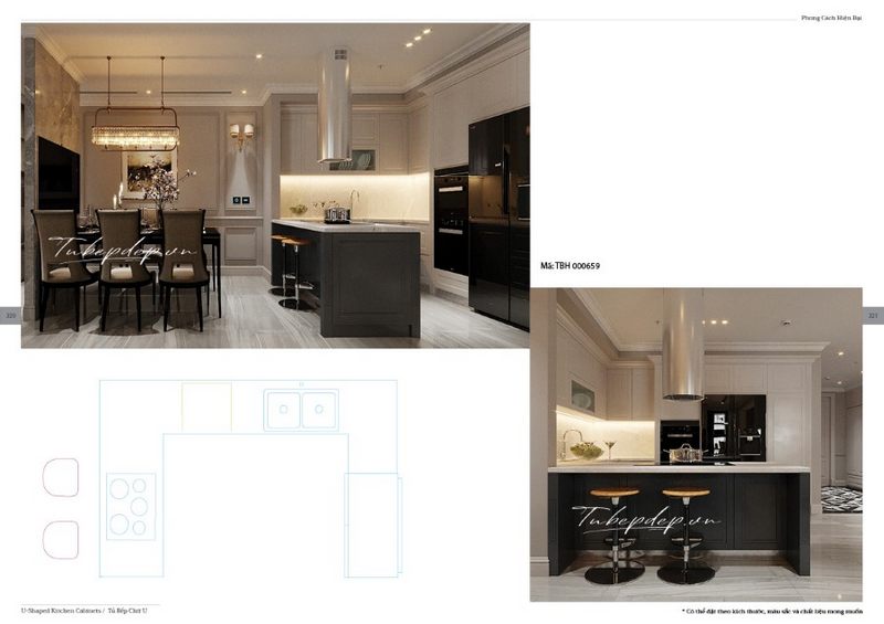 Thiết kế tủ bếp chữ U gỗ công nghiệp kết hợp quầy bar hoặc bàn ăn phụ nhỏ tạo tiện nghi cho người sử dụng