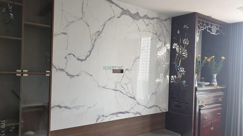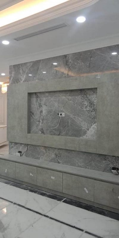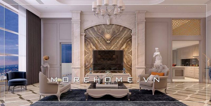 Biệt thự, chung cư có phòng khách được trang trí bằng đá ốp tường tự nhiên, vân mây nghệ thuật và ánh sáng bóng kết hợp với đá màu xám tinh tế, mang đến sự sang trọng và độc đáo.