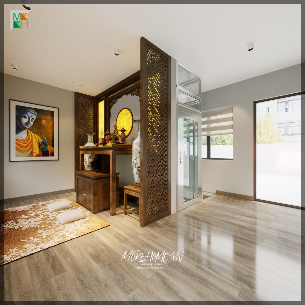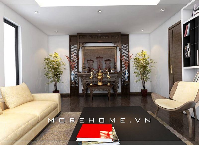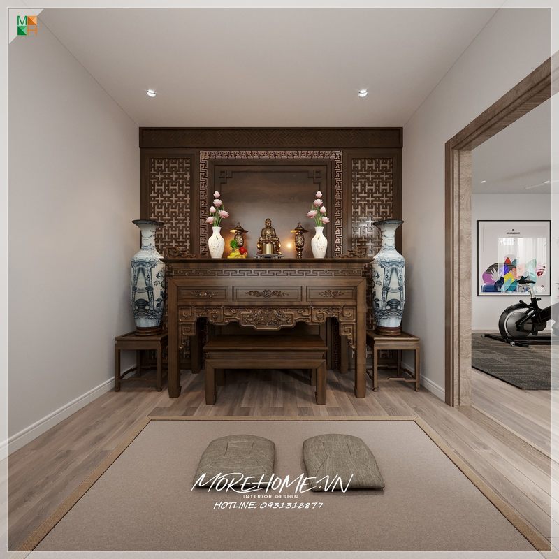 Sử dụng gỗ làm vật trang trí nội thất cho phòng thờ, hai bên lục bình trưng được đặt cạnh bàn thờ tạo nên vẻ đẹp cho cả phòng thờ của bạn.